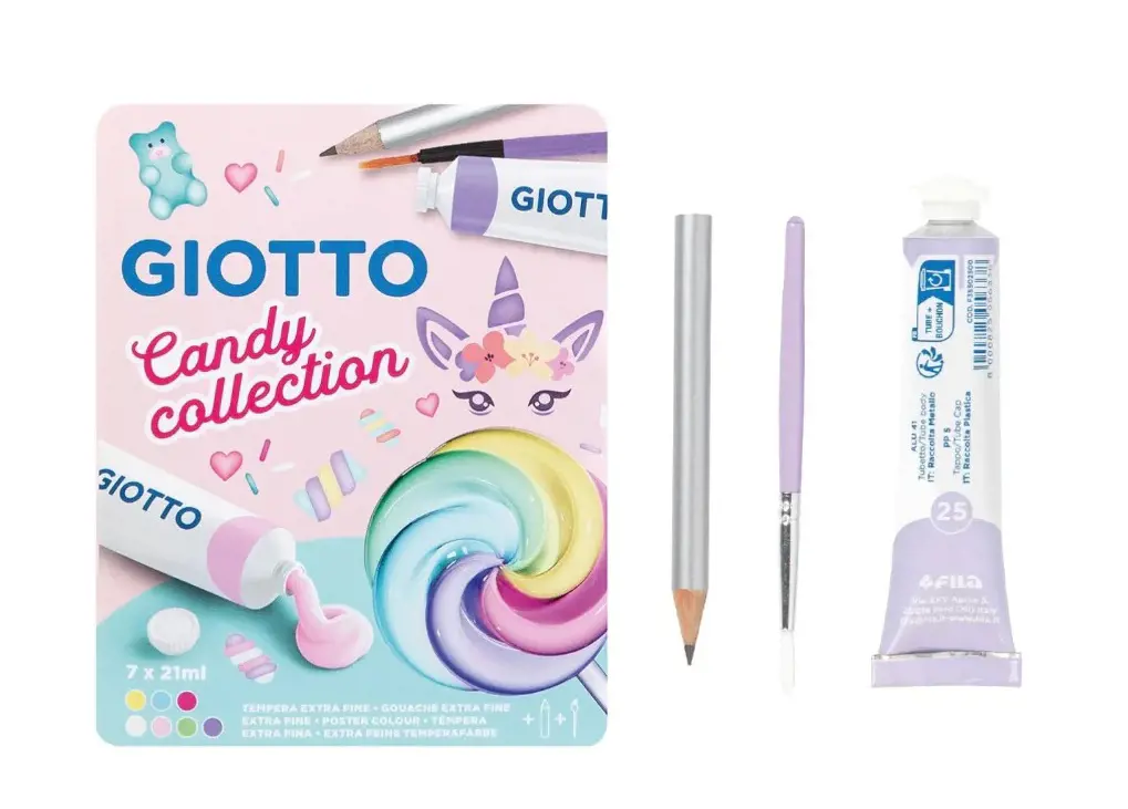 Candy Collection je nova šarena, svježa, kreativna, trendi kolekcija posvećena onima koji vole kreativnost i trendi boje. Sadrži 7 tubica tempera od 20 ml u 6 boja slatkiša + 1 bijela uključujući novu lila boju. Također je uključena 1 četkica s okruglim vrhom i 1 grafitna olovka 9 cm.