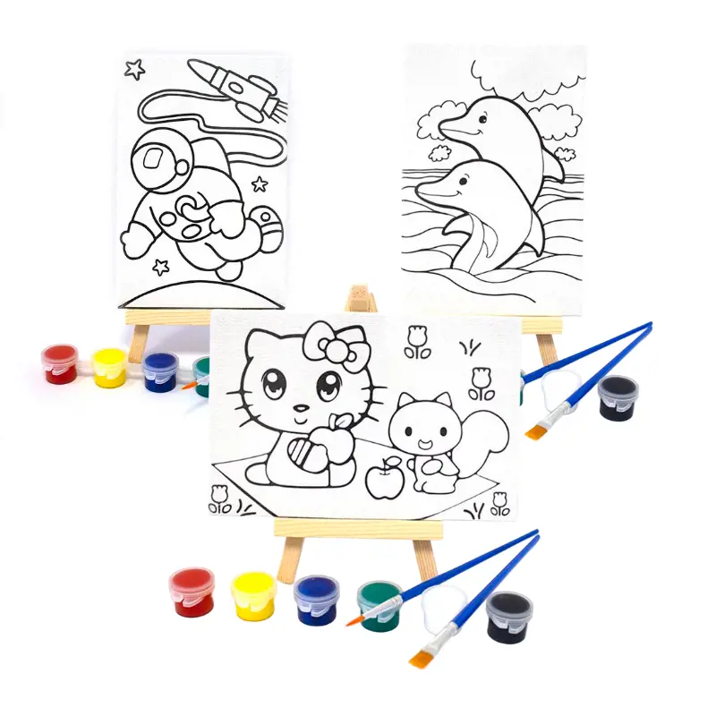 Pakovanje sadrži: mini štafelaj, slikarsko platno sa motivom, 6 boja (crvena, žuta, plava, zelena, bijela i crna) i dva kista.